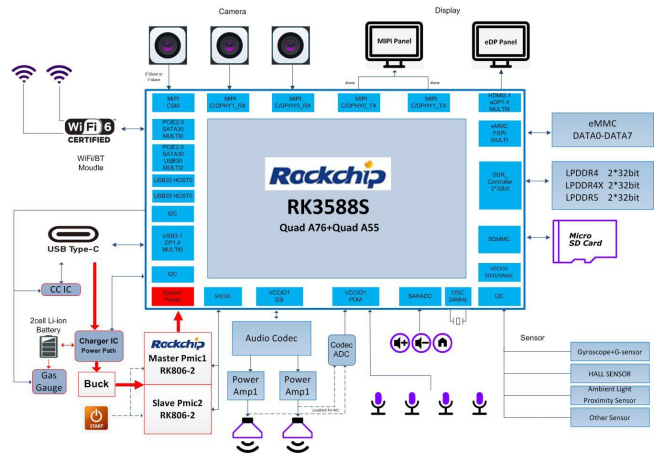 RK3588S同樣配備RK806-2雙PMIC的供電方案;存儲(chǔ)采用 LPDDR4X、eMMC、SD3.0;擁有 eDP TX、MIPI D/C PHY TX、MIPI D/C PHY RX、MIPI DPHY RX、PCIe20、TYPEC、音頻輸出、陣列MIC輸入等外設(shè)接口。