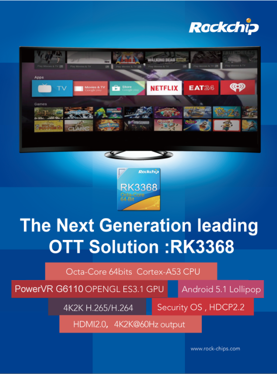 Terminal OTT BOX of Rockchip Electronics (hereinafter referred as Rockchip) subordinate new generation TV box solution RK3368 chip solution will be produced in volume. As the global only eight-core 64-bit OTT BOX chip in 2015, RK3368 may be the standard configuration for new generation flagship OTT BOX products.
