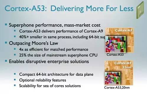 Cortex-A53 is the high-end product released by ARM based on 64-bit ARMv8 architecture and Cortex-A50 processor. It is the 64-bit processor with highest energy efficiency and smallest size in the world for the high performance and low consumption. Eight-core Cortex-A53 could be operated at full speed with high load; it can close the core and reduce frequency to be converted to low performance and low consumption with low load.