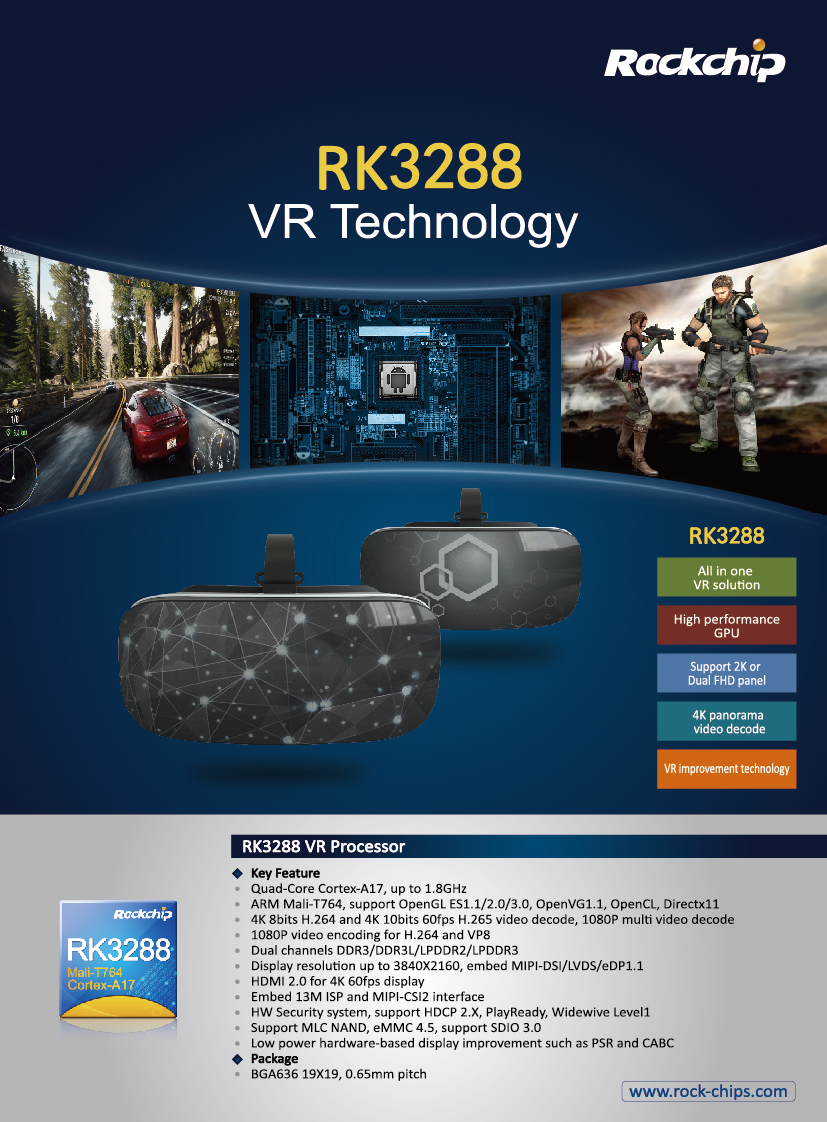Powered by RK3288, perfectly matches second generation standard of VR all-in-one, with quad-core cortex-A17 processor and Mali-T764 GPU. Also the performance of RK3288 in VR is lower than 20ms latency, over 75Hz screen refresh rate and over 1K gyroscope refresh rate. It supports optical software against distortion, dispersion, pupil distance adjustment algorithm and solve the problem of vertigo from optimizing of definition, visual distortion processing, gyroscope accuracy and stability, etc.